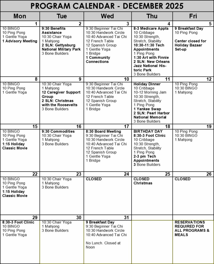 Please remember to register in advance for all meals, programs and trips. For our daily lunches, please call no later than 9:30 am to sign-up so that we can easily accommodate everyone. If you come every day and would like to be added on an ongoing basis, let us know and we can set that up, however, we ask that you call to cancel if you cannot make it. This helps our kitchen staff and we greatly appreciate your cooperation. Please remember to check into the computer system too! We need a record of all attendance to receive funding.