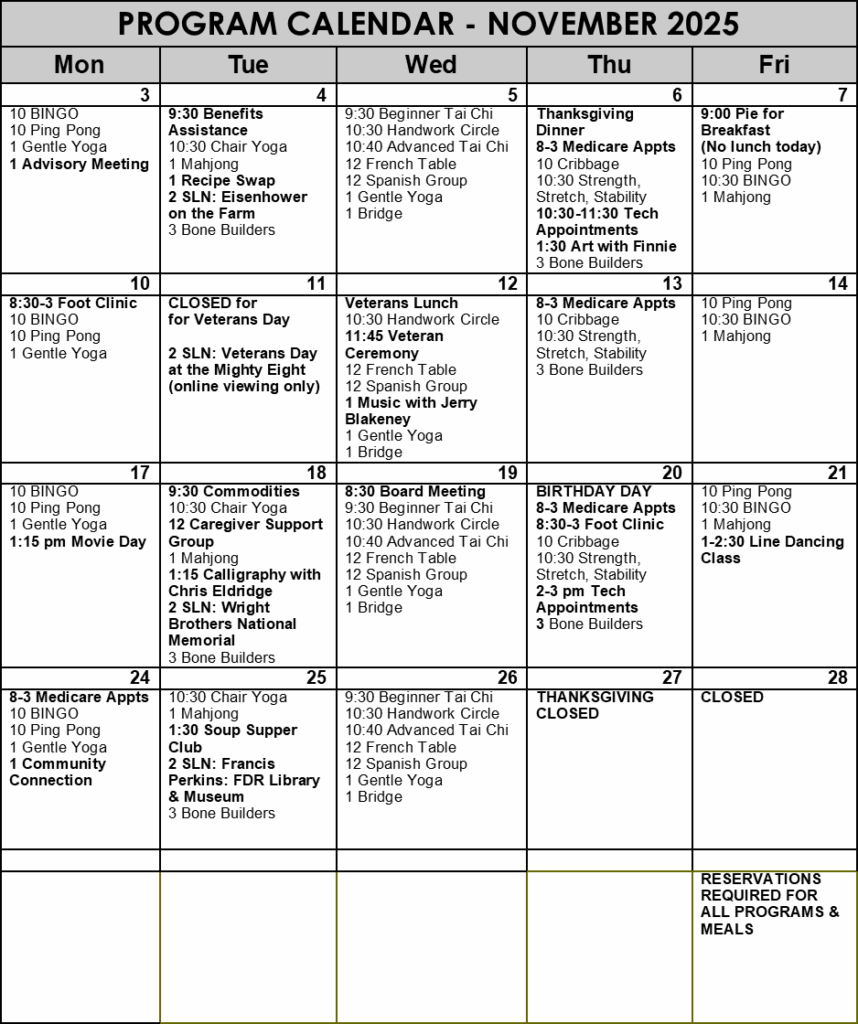 Please remember to register in advance for all meals, programs and trips. For our daily lunches, please call no later than 9:30 am to sign-up so that we can easily accommodate everyone. If you come every day and would like to be added on an ongoing basis, let us know and we can set that up, however, we ask that you call to cancel if you cannot make it. This helps our kitchen staff and we greatly appreciate your cooperation. Please remember to check into the computer system too! We need a record of all attendance to receive funding.