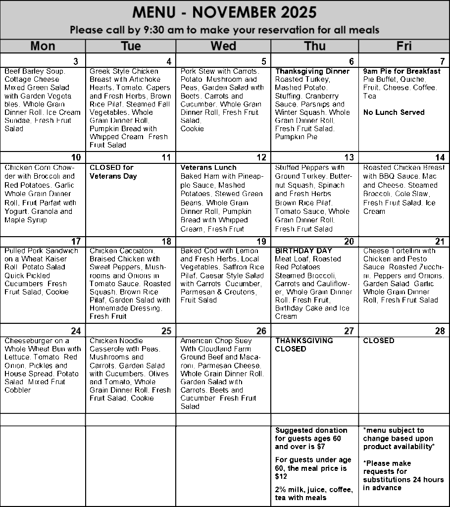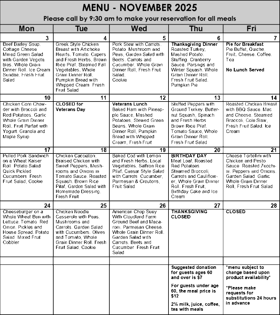 Please remember to register in advance for all meals, programs and trips. For our daily lunches, please call no later than 9:30 am to sign-up so that we can easily accommodate everyone. If you come every day and would like to be added on an ongoing basis, let us know and we can set that up, however, we ask that you call to cancel if you cannot make it. This helps our kitchen staff and we greatly appreciate your cooperation. Please remember to check into the computer system too! We need a record of all attendance to receive funding.