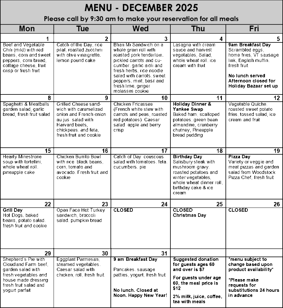- Sign up for meals by 9:30, or as soon as possible as they are on a first-come-first-serve basis. Please indicate allergies or food restrictions in advance. 802-457-3277