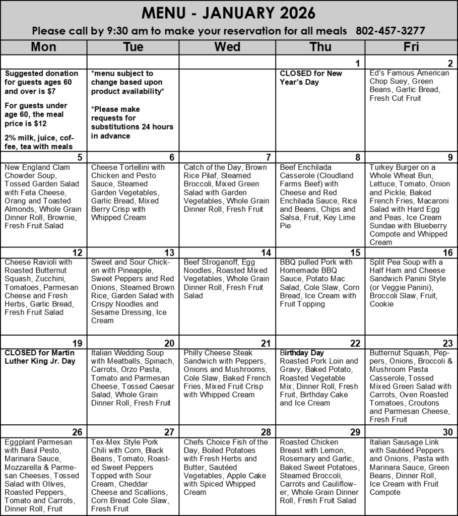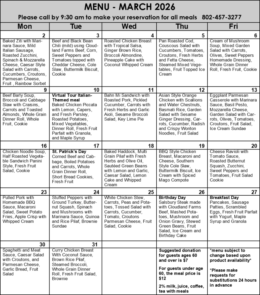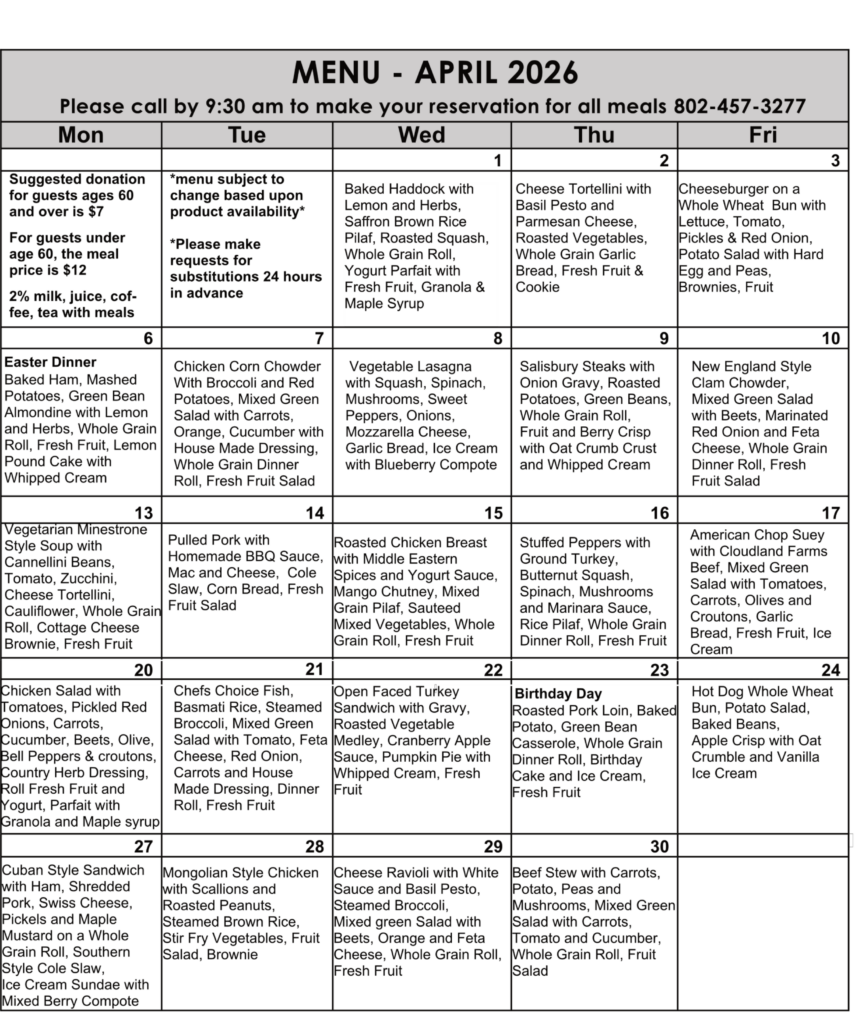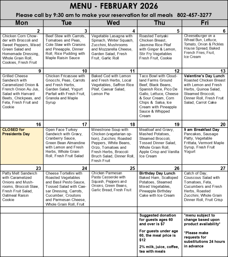- Sign up for meals by 9:30, or as soon as possible as they are on a first-come-first-serve basis. Please indicate allergies or food restrictions in advance. 802-457-3277
